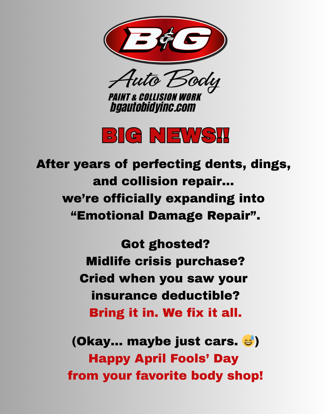 We might have a little fun with April Fools, but when it comes to our work, there’s nothing we take more seriously than quality. At B&G Auto Body, every repair is handled with attention to detail, skilled craftsmanship, and a commitment to getting the job done right. Whether it’s minor cosmetic work or major collision repair, our team focuses on restoring vehicles to look their best and perform safely.